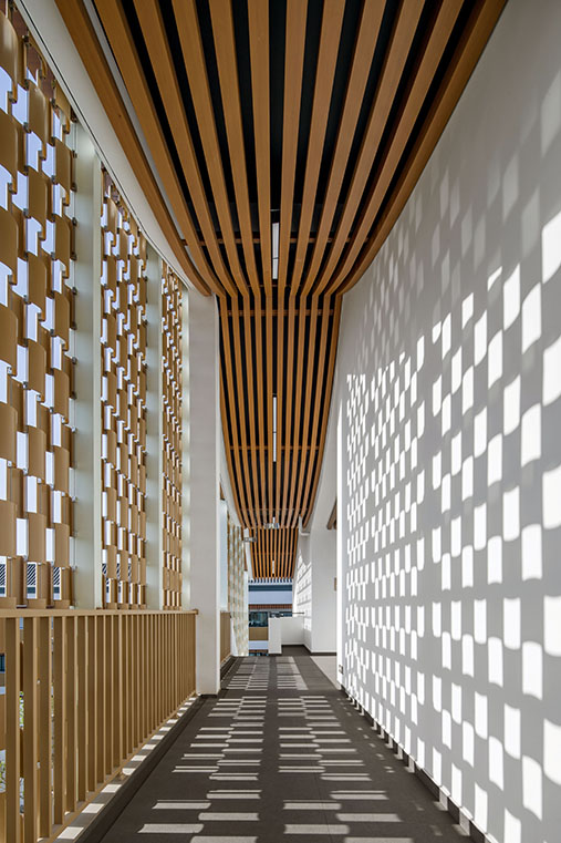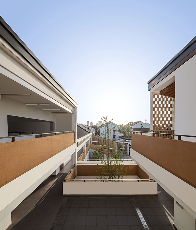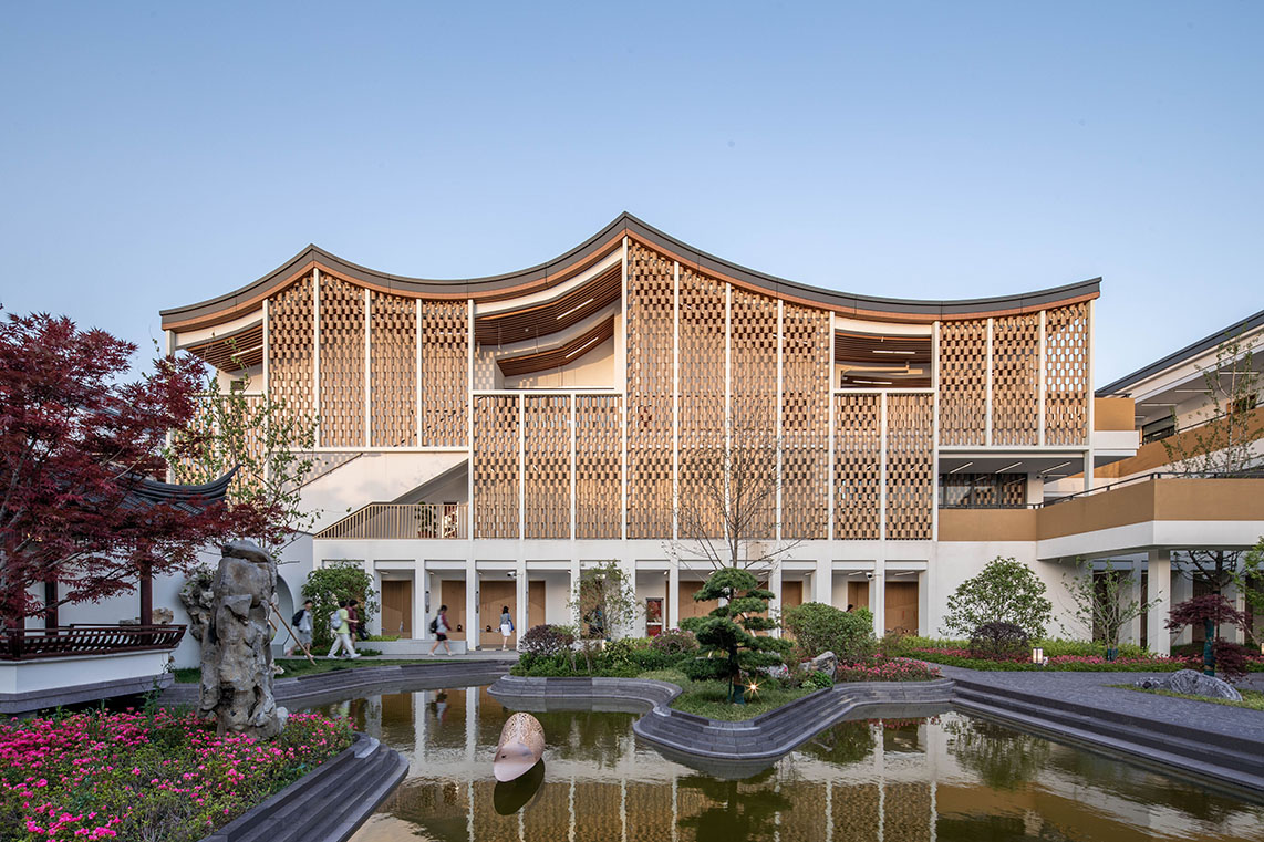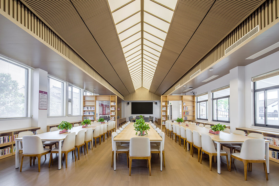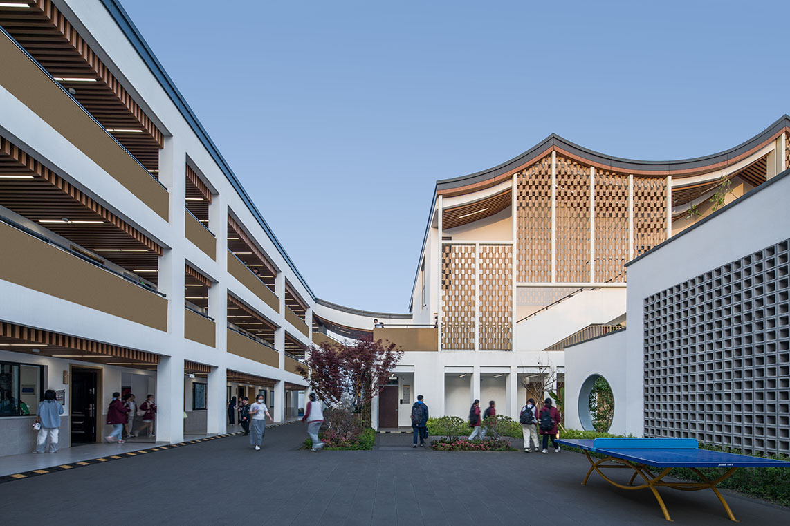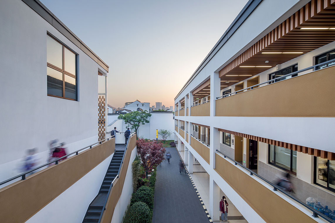 項目秉承“傳承與創新”的理念,在尊重古城風貌和保護周邊控保建筑的前提下,探索新中式學校建筑風格。設計通過對地下空間的利用、相同尺度空間的疊合、立面手法削弱大體量空間尺度感等方式,合理巧妙的把新校區大尺度功能空間與古城區小尺度街坊融合在一起,彼此間并不突兀。建筑通過圍合的方式在場地內部留出一處內院,與控保建筑隔墻呼應,結合古城風貌特色打造校園文化園林,讓新建學校與古城街坊融為一體,打造功能完善、環境優美的現代化校園。