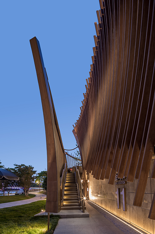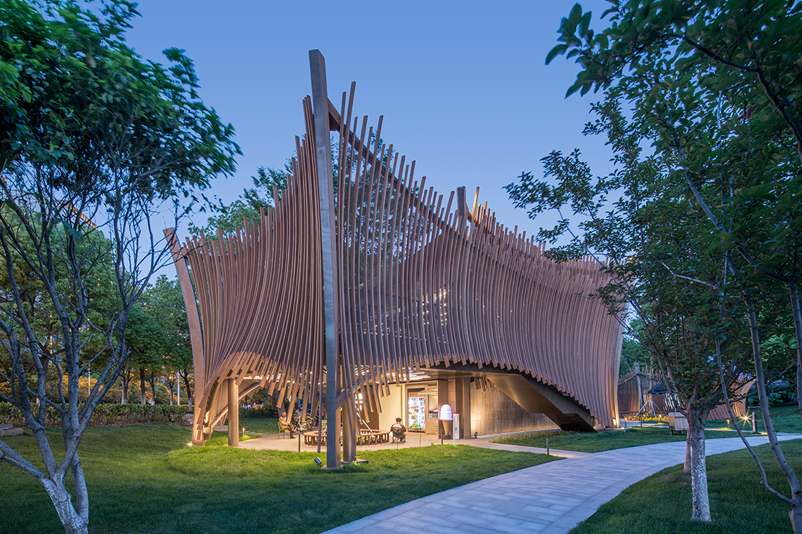 設計以自然幾何為語,整體外部木色參數化設計表皮環繞,內襯相近顏色金屬網,以參數化設計的雕塑感表皮包裹內部建筑主體的形式創造極佳的趣味性及光影感,與周邊樹林形成呼應的強調了建筑設計的在地性。在這里,每一步都踏著綠意,每一次呼吸都飽含清新。